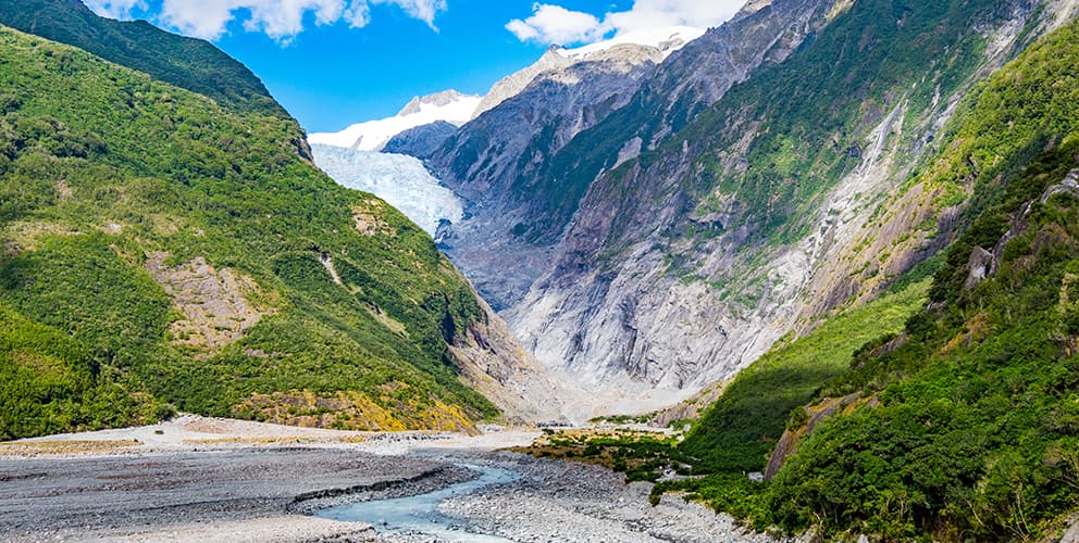 ニュージーランドの「テ・ワヒポウナム 」には、氷河の絶景があります。フォックス氷河は1日に3mも流れ落ち、深い氷の裂け目や美しい氷のトンネルを生み出します。