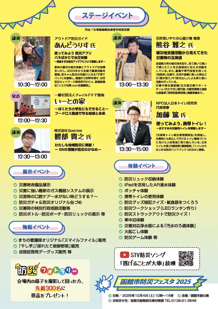 はこだて防災マルシェ2025のご案内✨ 日時:2025年9月27日 土 10:00〜15:30 会場:函館市地域交流まちづくりセンター 入場:無料とにかく楽しいイベントです!函館消防本部会場2階多目的ホールの後ろ側で AEDの講習 が体験できます👩🏻🚒 いざという時のために。