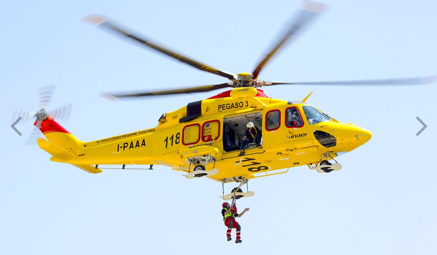 黄色と赤のヘリコプターで、地面には男性がおり、その底には「救助」という文字が書かれている。Premium AI生成画像。