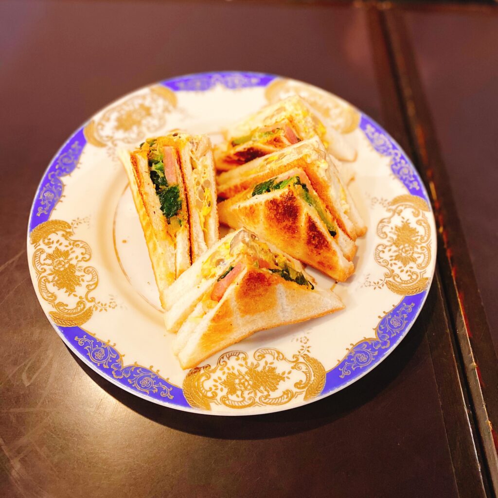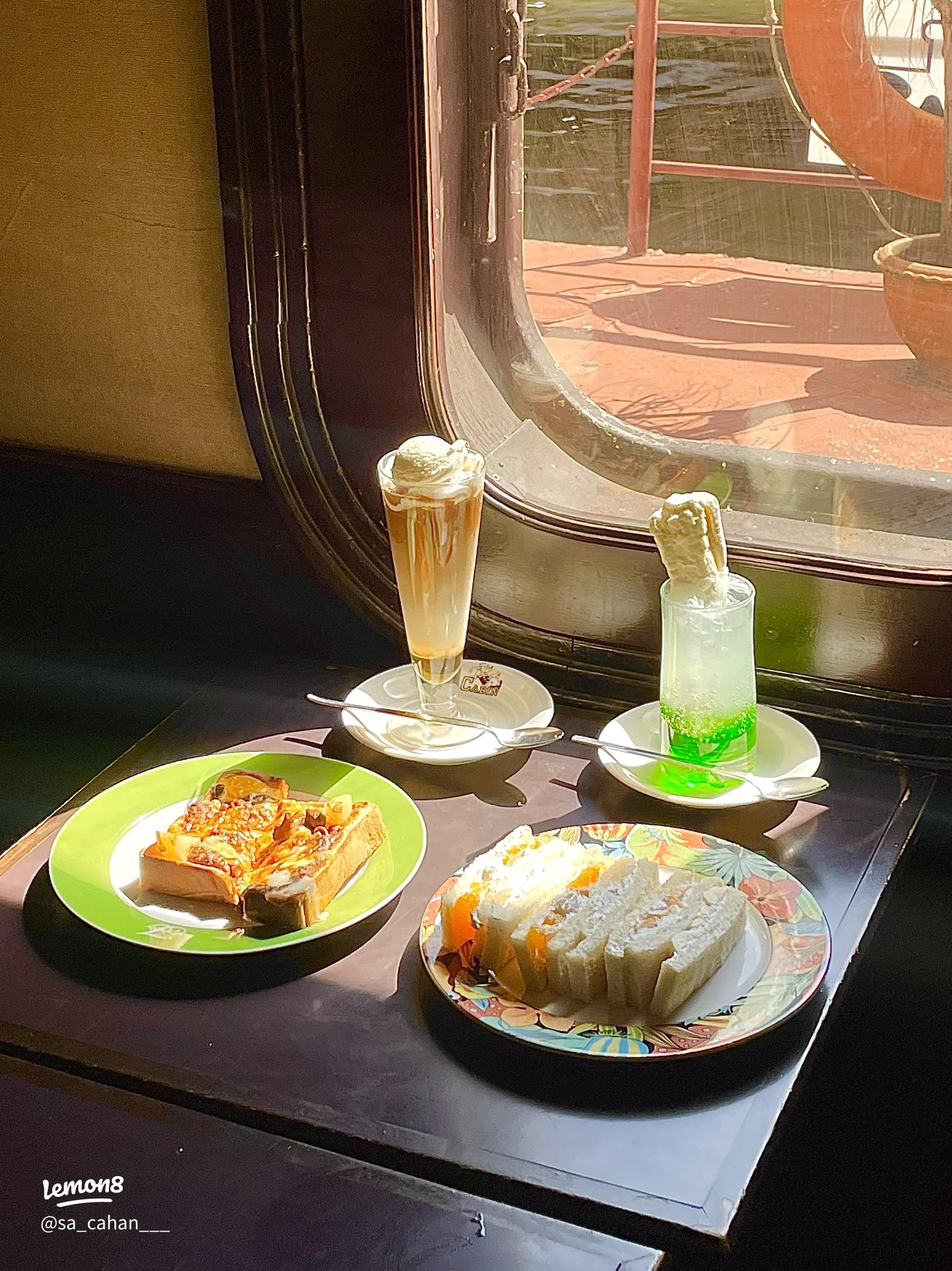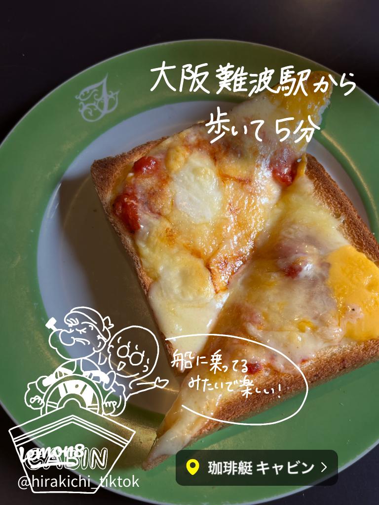 難波「珈琲艇キャビン」 -注文内容- ・チーズトースト 800円 ・アイスコーヒー450円 昭和50年創業の船に見立てたコンセプトで豪華客船の客席や船内の様な内装が素敵! 注文はQRコードを読み取るシステムなので スマホを忘れないように注意です笑 チーズトーストは人気No.2。