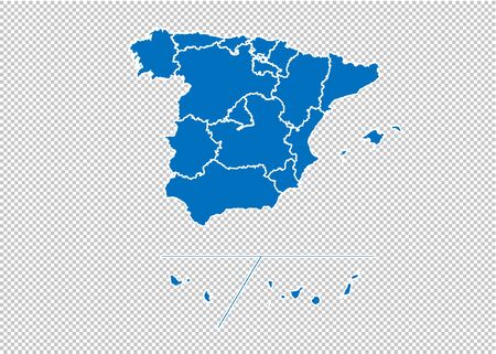スペインの州の地図-スペインの州の郡 地域 州を含む詳細な青い地図。透明な背景に分離されたスペインの州の地図。のイラスト素材・ベクター Image127909113。