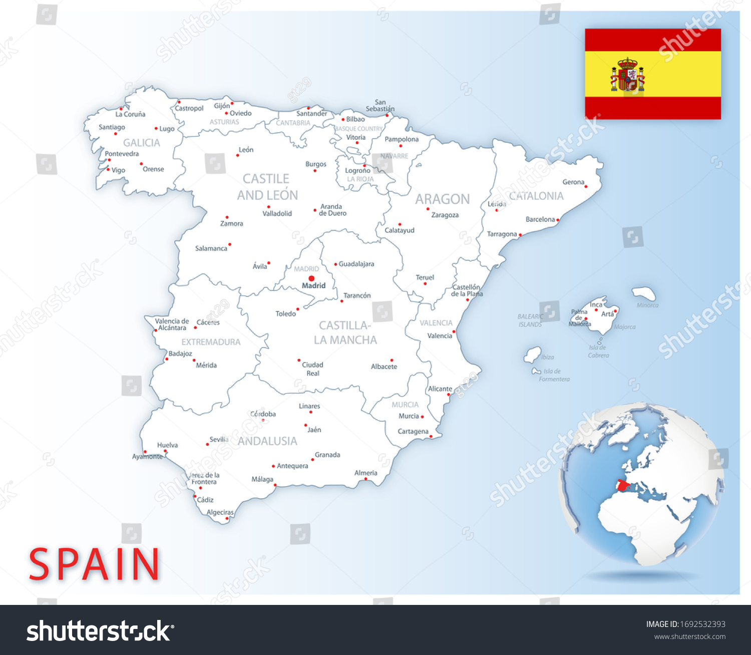 スペインの行政区分の詳細な地図。国旗と地球上の場所が記載されています。ベクターイラスト」のベクター画像素材 ロイヤリティフリー1692532393Shutterstock。