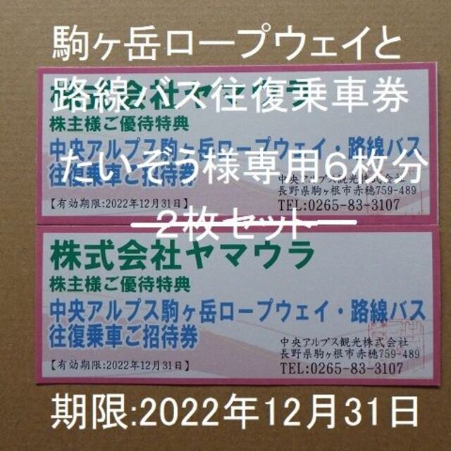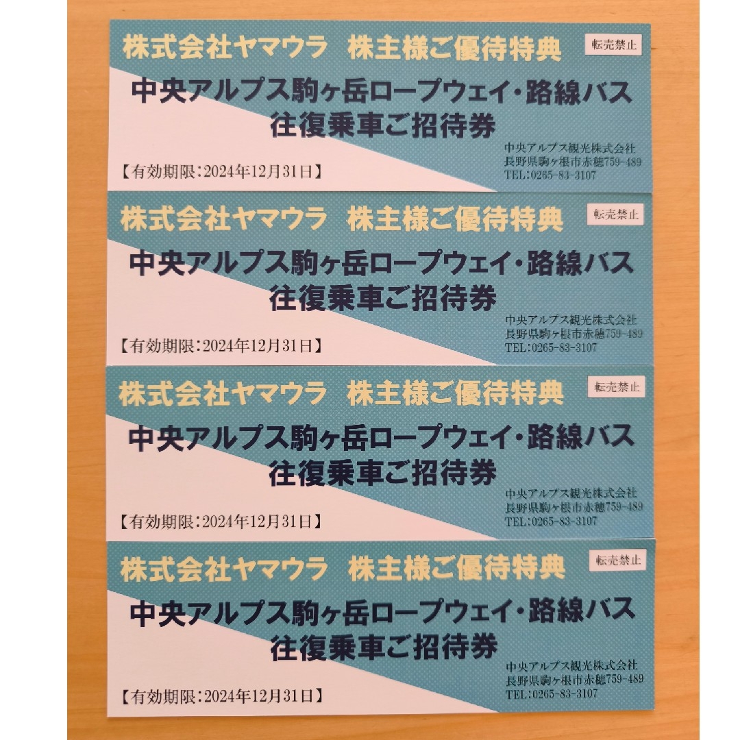4枚 中央アルプス駒ヶ岳ロープウェイ 優待乗車券 往復チケット 株主優待券・割引券。