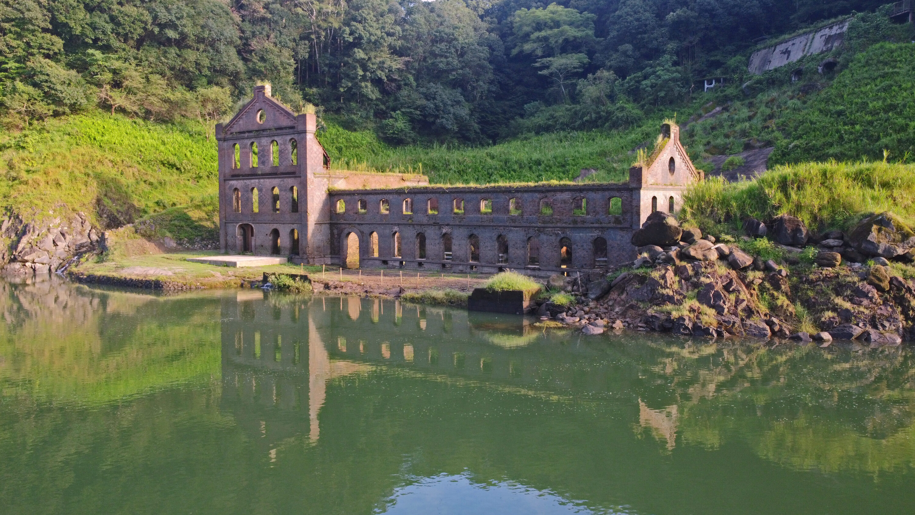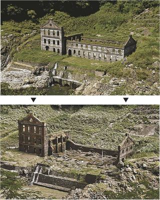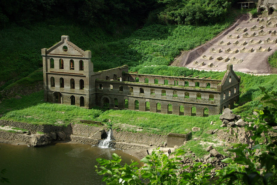 近代化産業遺産・曽木発電所遺構がダムの底から姿を現した 空撮したらファンタジックな風景がねとらぼ。
