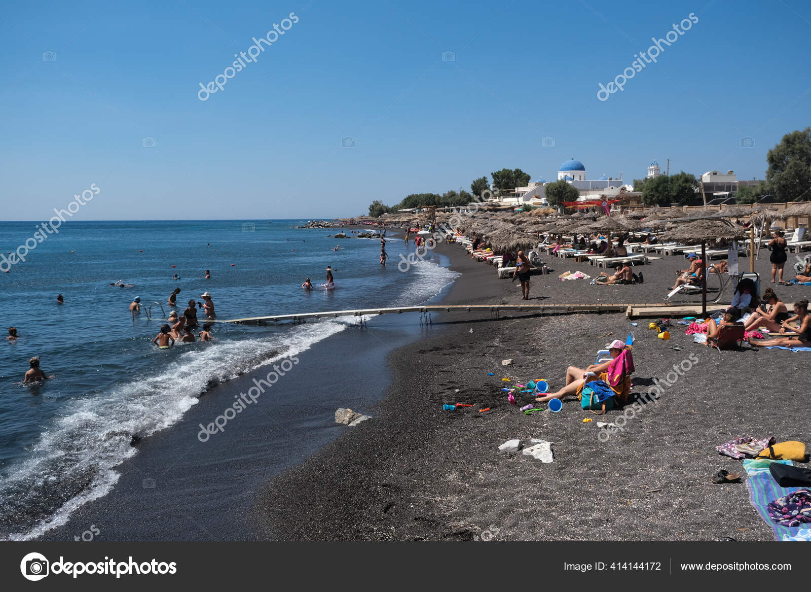人々は2020年8月13日にギリシャのサントリーニ島とペリッサビーチで晴れた日と海を楽しむ — ストック編集用写真©Ale_Mi 414144172。
