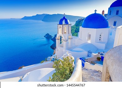 ギリシャのサントリーニ。サントリーニ島のチャーミングビューオイアビレッジ。エーゲ海のカルデラの上にある伝統的な有名な青いドーム教会。従来の青と白のCycladesアーキテクチャー。写真素材1445544767Shutterstock。