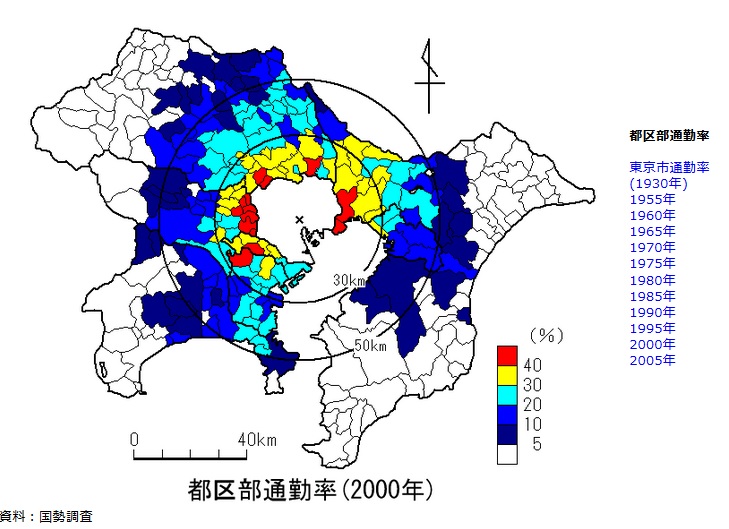 谷謙二 TANI Kenji on X: "東京都区部の通勤圏は、95年以降20%通勤圏でかなり縮小したし、東京都区部への通勤者自体も減少しているので、列車の本数が減ってもおかしくない。https:t.co zpoJwuBcrx"X。