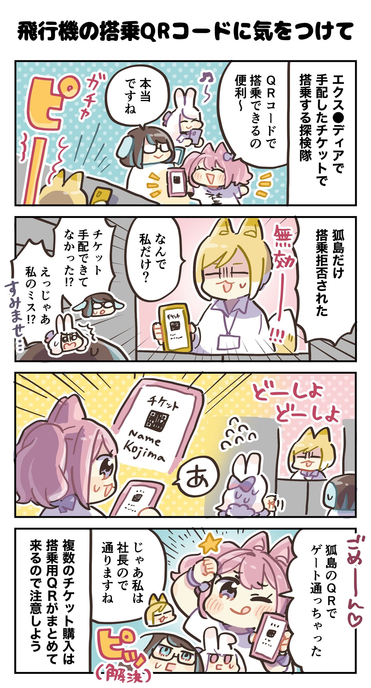 4コマ漫画:飛行機の搭乗QRコードに気を付けて4コマ漫画:どめいん島巡り。