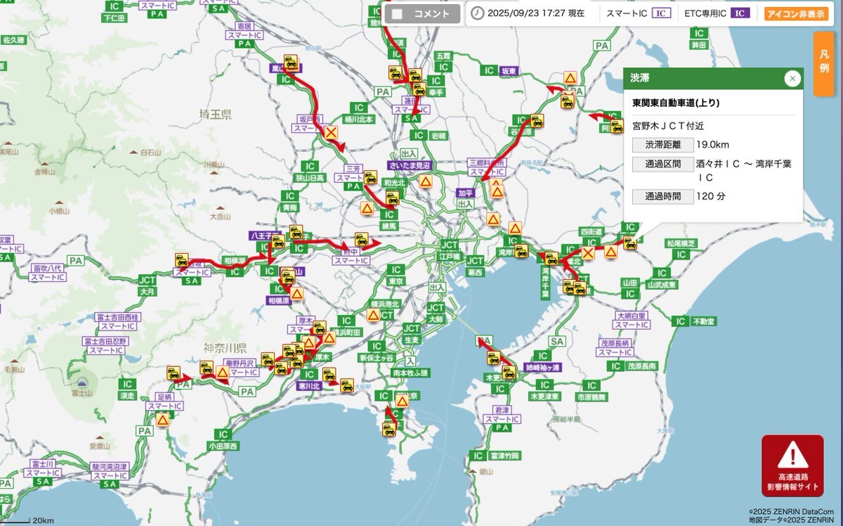 東関東自動車道湾岸市川IC付近で追突事故、別の接触事故と故障車でカオス状態「成田空港行きリムジンバスにトラック追突、乗ってるお客さん飛行機間に合わなそうで可哀想」車線規制で 渋滞東関東道 9月27日まとめ部。