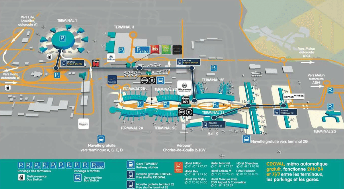 パリ シャルル・ド・ゴール空港 のホテル送迎無料シャトルバス乗り場への行き方と時刻表 ホテルシャトルバスを利用するメリット、ターミナル間移動の有無の見分け方、シャトルバス乗り場へのアクセス、シャトルバスの乗り場と時刻表、ホテルから 空港への戻り方特典。