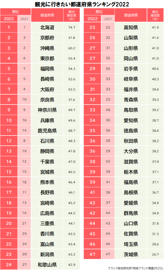 観光に行きたい都道府県ランキング」上位の順位に変動あり地域ブランドNEWS。