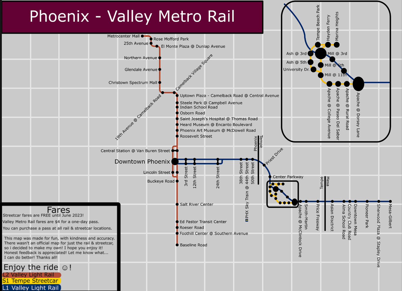 やあ、フェニックス!今日の、そして2024年のValley Metro Railのマップを作ったよ!楽しんでくれると嬉しいな、フィードバックも大歓迎!: r phoenix。
