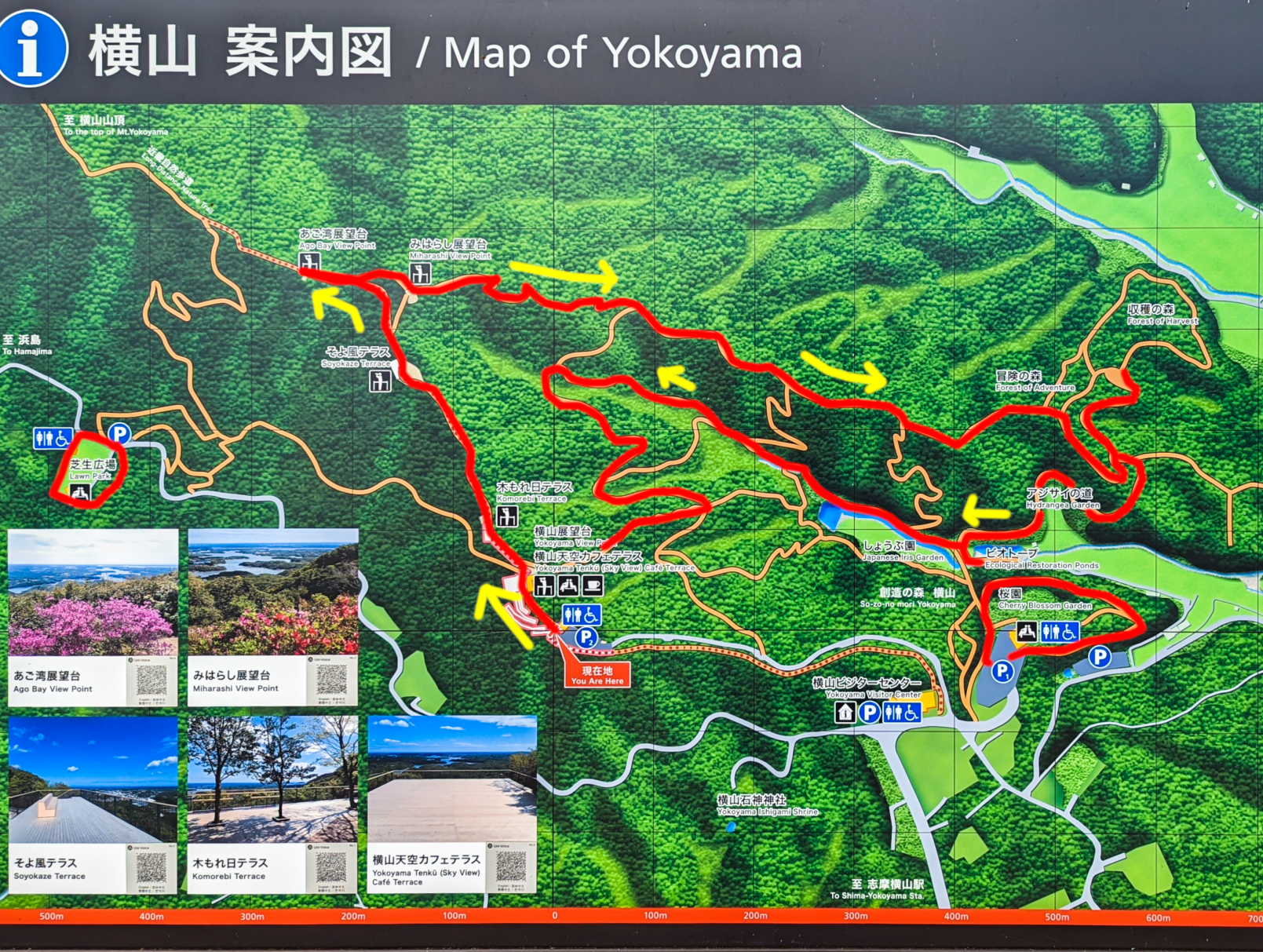 どの展望台から見る英虞湾が好き?, 📍横山展望台, ①天空カフェテラスの, ②木もれ日テラス, ③そよ風テラス, ④みはらし展望台,⑤英虞湾展望台, ⑥天空カフェテラスのデッキから, 🗺️〒517-0501志摩市阿児町鵜方875-20, 💰入場無料,🚗①玉城ICからサニーロード経由で約50分, ②第二伊勢道路白木ICより国道167号、県道112号、県道17号を経て約30分,。