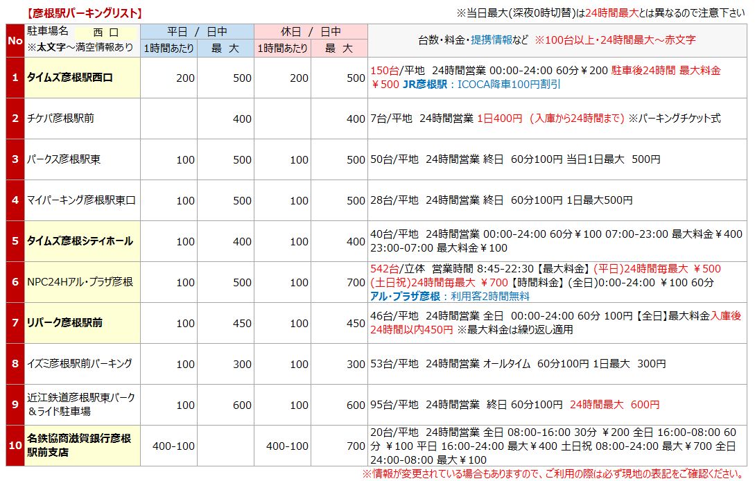 彦根駅の駐車場まとめ!西口・東口で安いのは?最安値200円を発見!ホンデシガ 滋賀県の地域情報サイト。