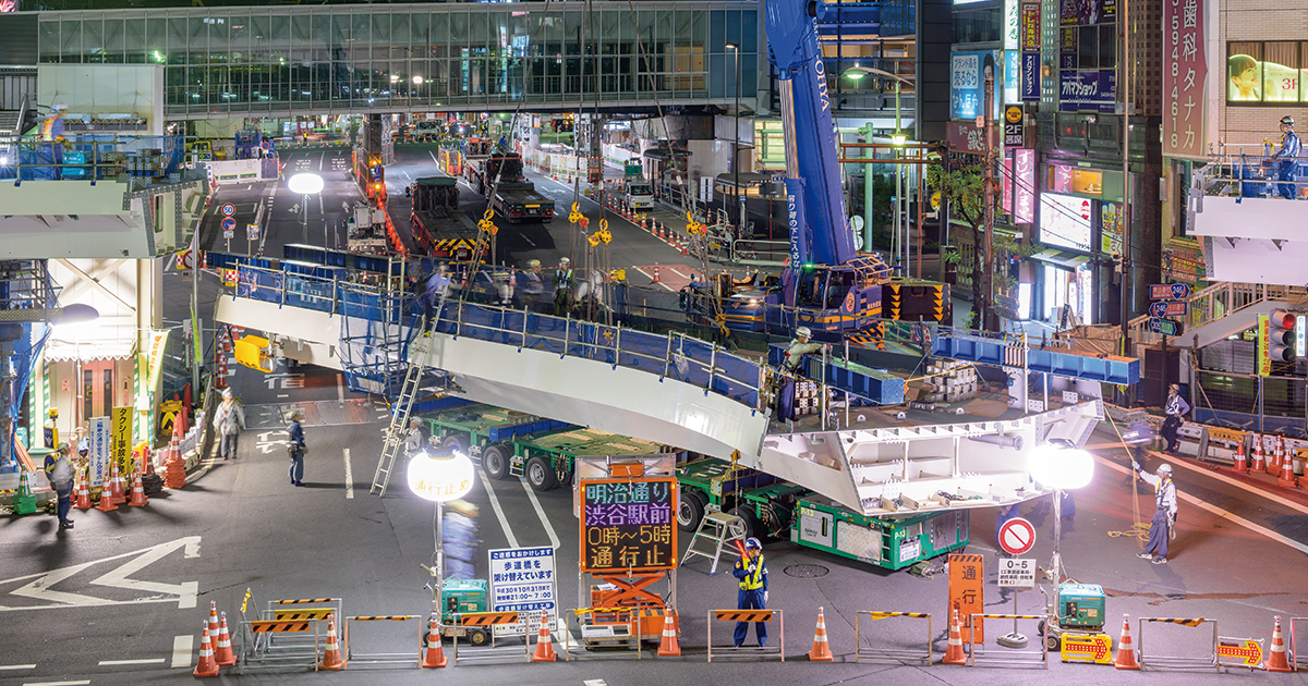深夜の渋谷駅東口交差点で歩道橋架け替え工事 巨大橋桁をリフトアップ - シブヤ経済新聞。