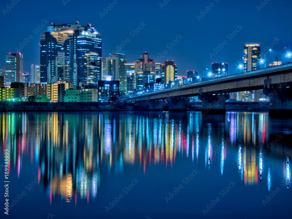 淀川と大阪の都市夜景,梅田スカイビル,Urban night view of Yodogawa and Osaka city,Umeda SkyBuilding Stock PhotoAdobe Stock。