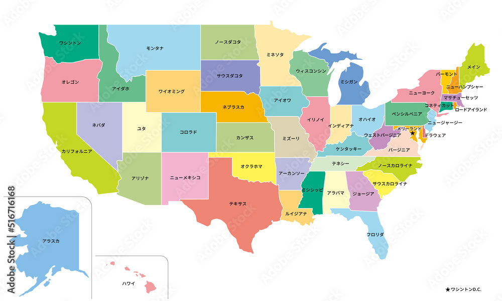 アメリカ合衆国の地図、全50州、日本語の州名 Stock VectorAdobe Stock。