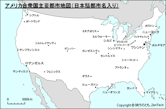 アメリカ合衆国主要都市地図 日本語都市名入り- 旅行のとも、ZenTech。