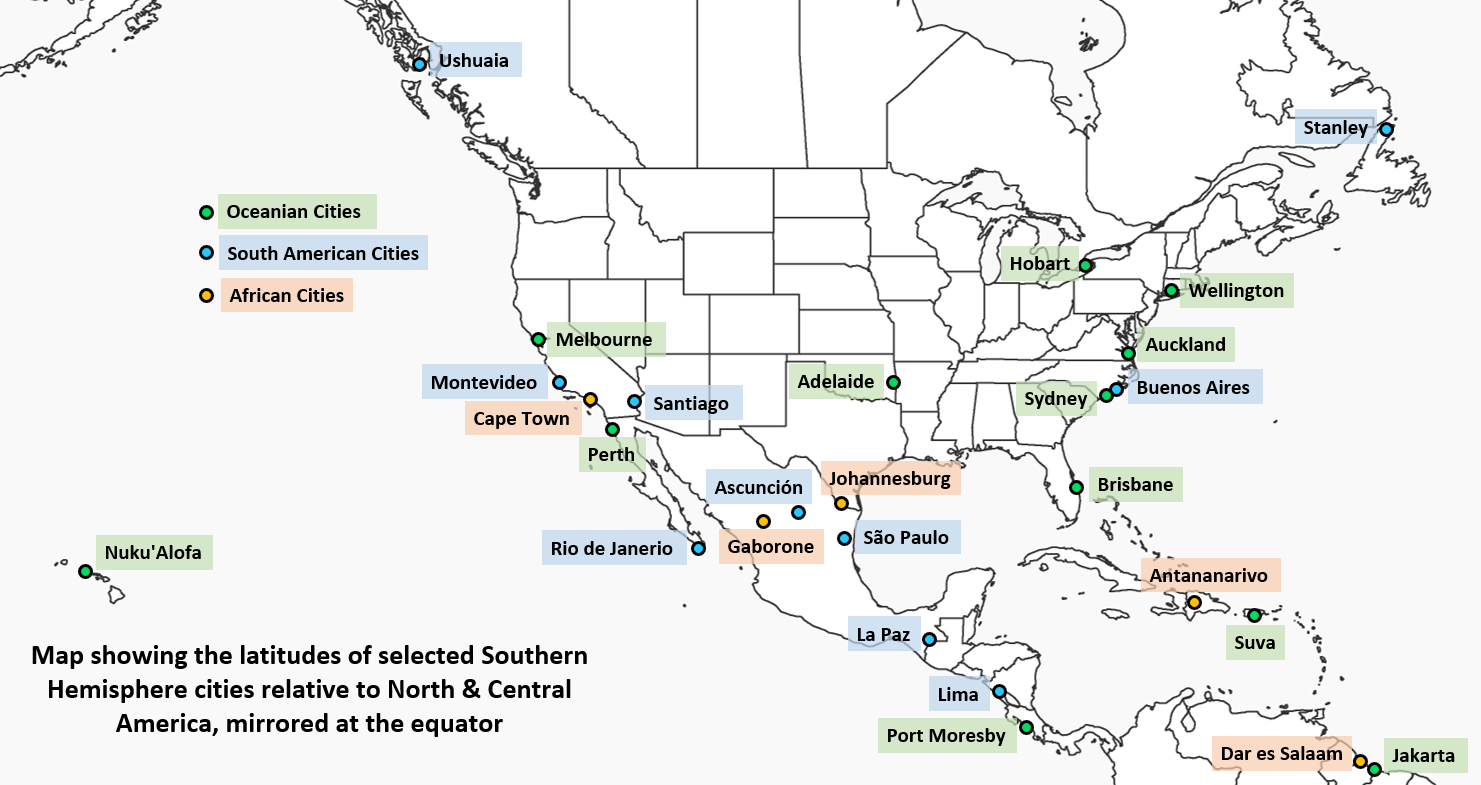北米の主要都市は、同じ緯度で大西洋全土の都市に置き換えられた。