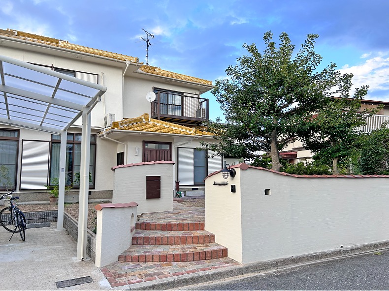 S様邸 石畳風アプローチと洋瓦の白壁が温もりあふれる、プロヴァンススタイルのエクステリアエクステリア・外構工事奈良県奈良市のハシグチガーデン。