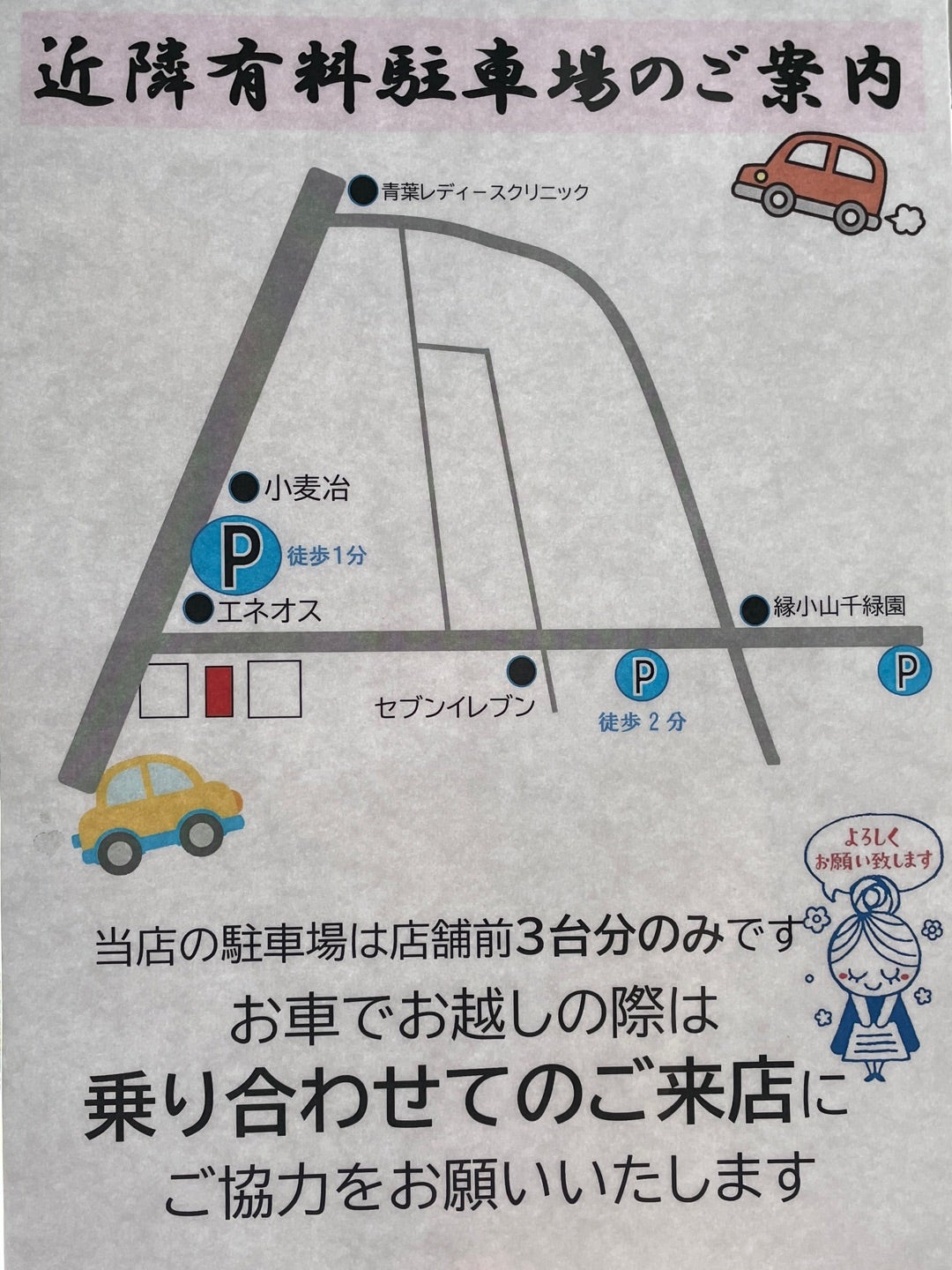 お車でお越しのお客様にお願いです🙇♀️ 当店、駐車場の駐車場台数に限りがございます。 できる限りお客様同士お乗り合わせのご協力をお願いします🙇♀️。