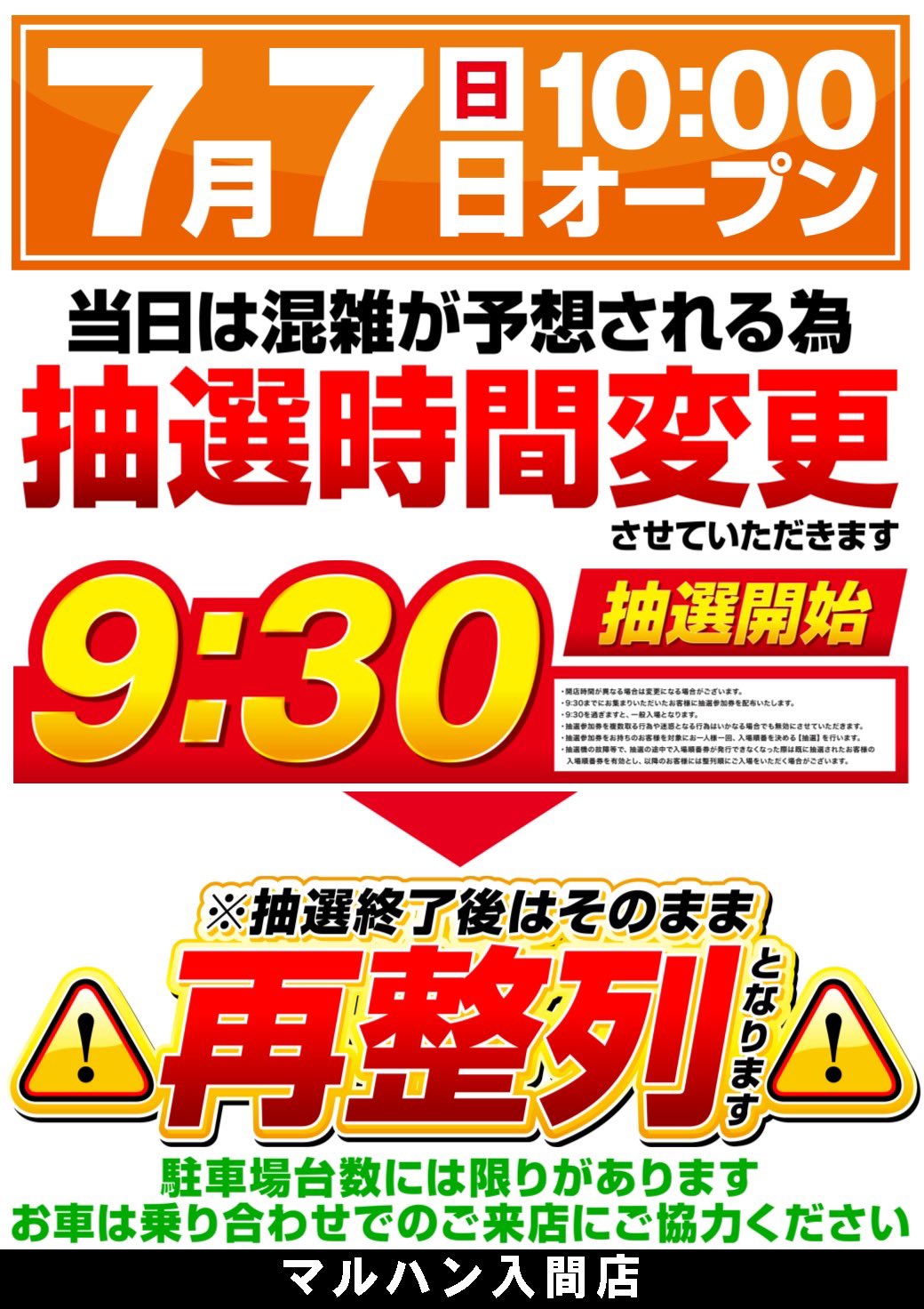 ぷちまる🐥@成長日記⤴️⤴️ on X: "キョンマネです。 真夏日が続いてますね。 さて、マルハン入間店からご案内となります。7 7は混雑が予想される為、抽選時間がいつもより早くなって 9時30分 開始予定となります。駐車場にも限りがございますのでお車は極力。