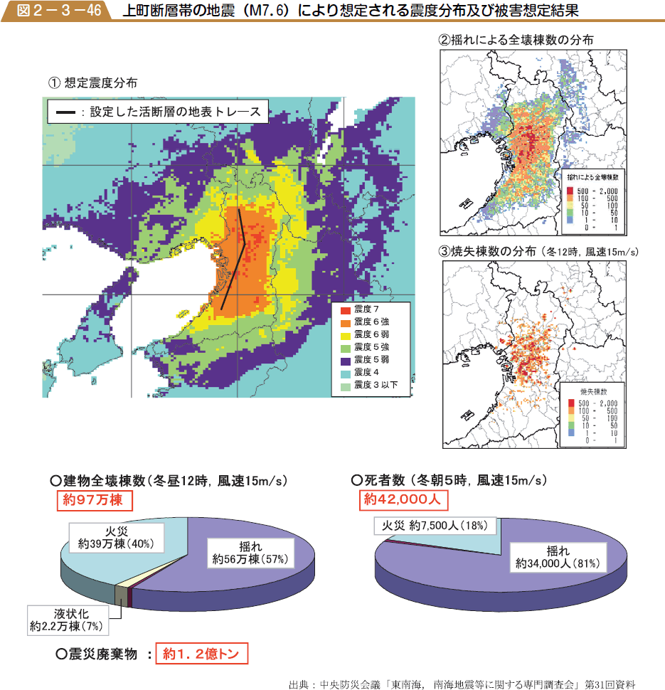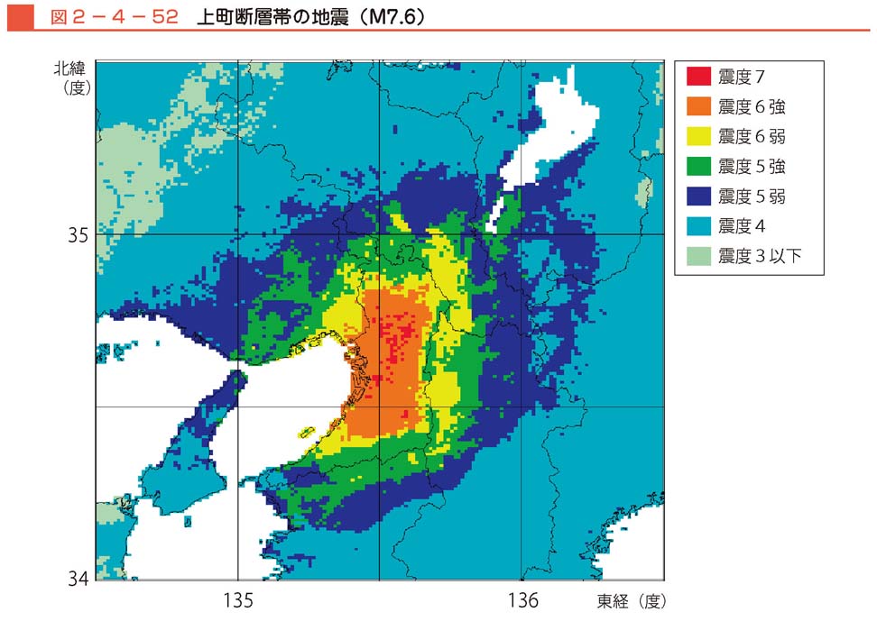 図2−3−46 上町断層帯の地震 M7.6 により想定される震度分布及び被害想定結果 : 防災情報のページ - 内閣府。