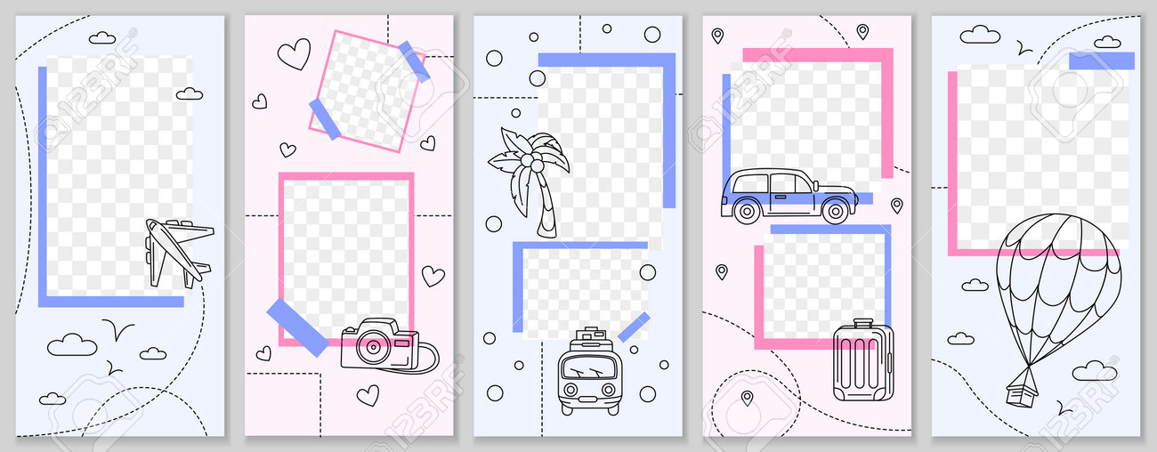 旅行ストーリーテンプレート。落書きの夏の観光。ブランドの投稿レイアウトをスケッチします。休暇の飛行機のフライトと車の旅のバナー。ビーチレスト。写真の透明なフレーム。ベクターブログの背景セットのイラスト素材・ベクターImage 196001366。