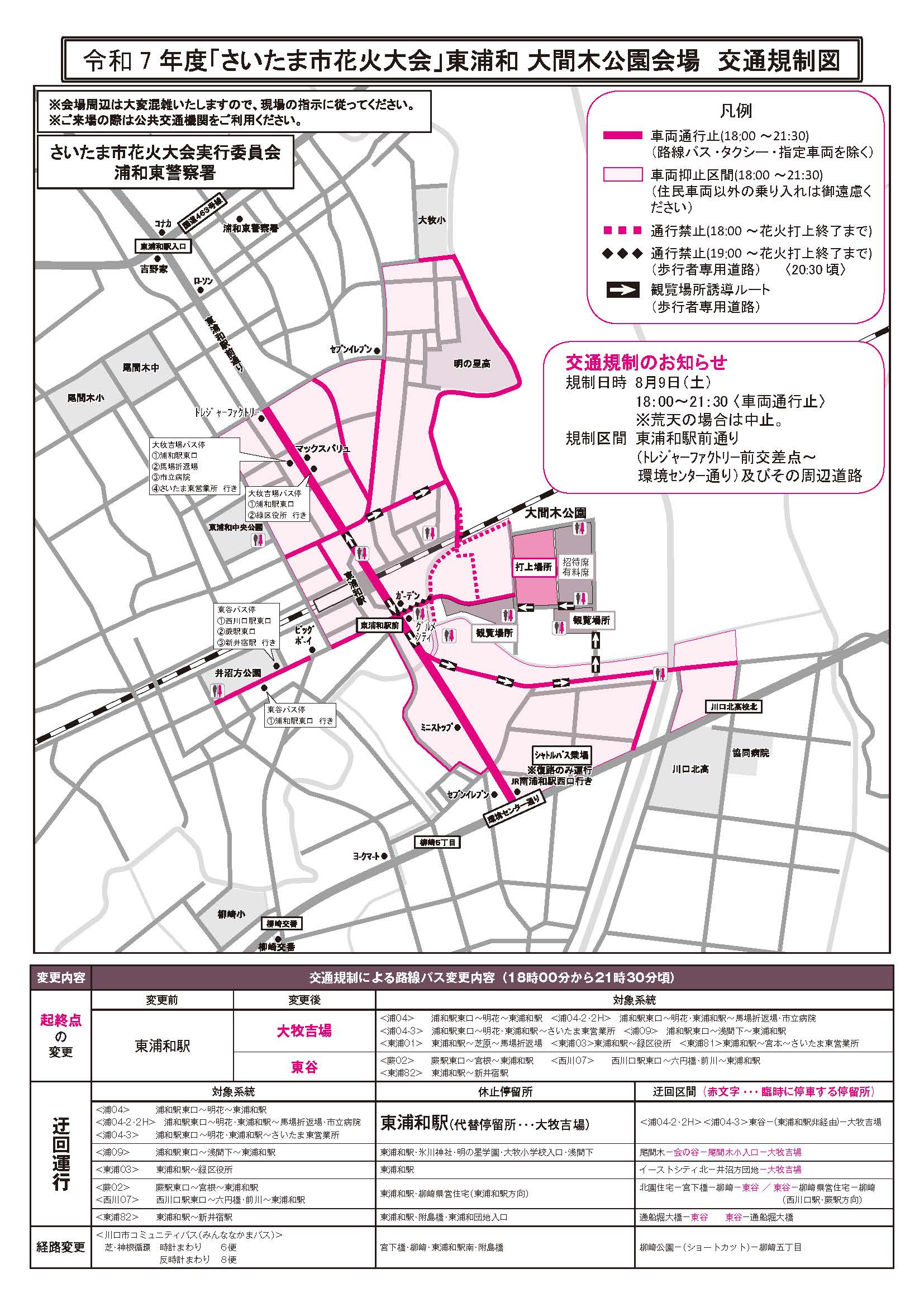⚠️注意⚠️ 国際興業バスからのお知らせ。 さいたま市花火大会 東浦和大間木公園 に伴う運行経路変更、停留所休止のお知らせです。8 9 土 18時〜21時30分まで。