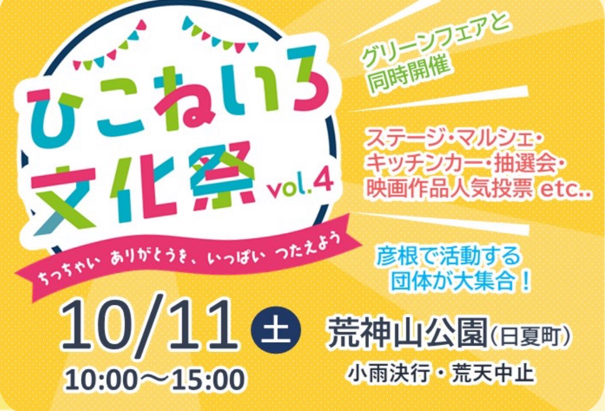 彦根市広報 🏯 on X: "彦根で活動する人が大集合する野外イベントを今年も開催します! 10月11日 土 午前10時から午後3時 場所:荒神山公園 彦根市日夏町4769※少雨決行・雨天中止 https:t.co 25Pfmd21BEhttps:t.co VwGrL3j7uS"X。