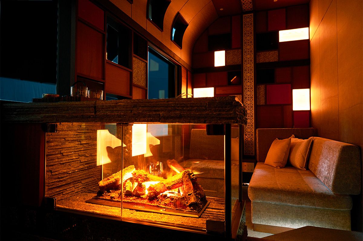天井の高さが特徴的なこの客室は「デラックススイート」です。「TRAIN SUITE 四季島」に一室しかないこちらの客室では、大きな窓から車窓の風景を心ゆくまでお楽しみいただけます。夜は暖炉の明かりが幻想的に部屋の中を照らし、空間の贅沢さと上質さを感じられます。
