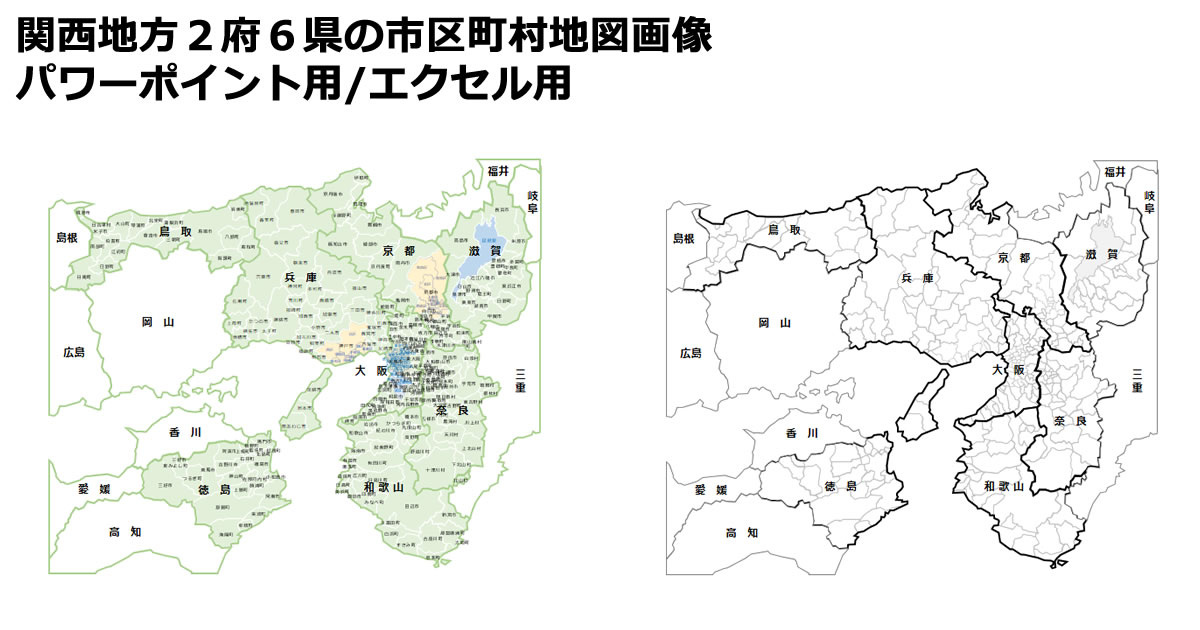 関西地方2府6県の市区町村地図 パワーポイント エクセルフリー素材、無料素材のDigipot。