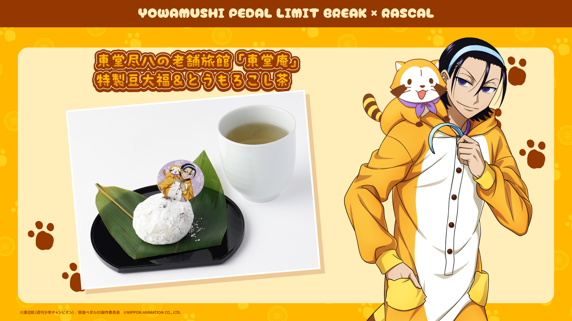 Chugai Grace Cafe on X: " 弱虫ペダル LIMIT BREAK × ラスカルコラボメニューをご紹介! 「東堂尽八の老舗旅館「 東堂庵」特製豆大福&とうもろこし茶」 ラスカルの好物、とうもころしを使用したお茶と一緒にお召し上がりください♪ご予約はこちら▷https:t.co。