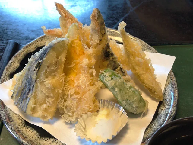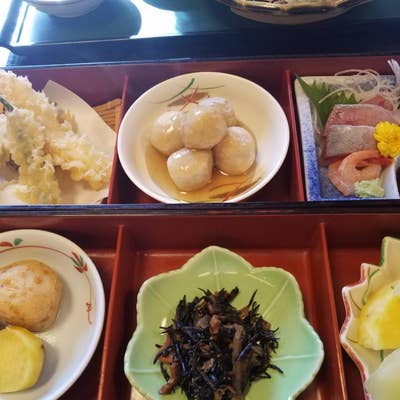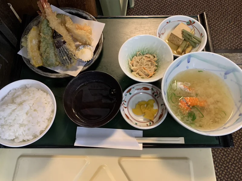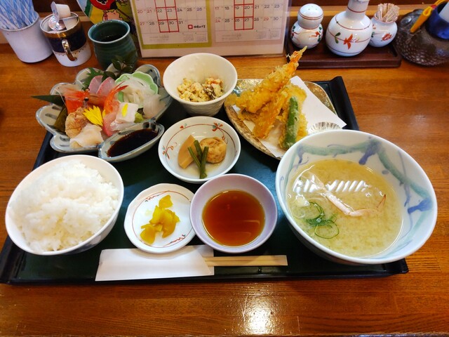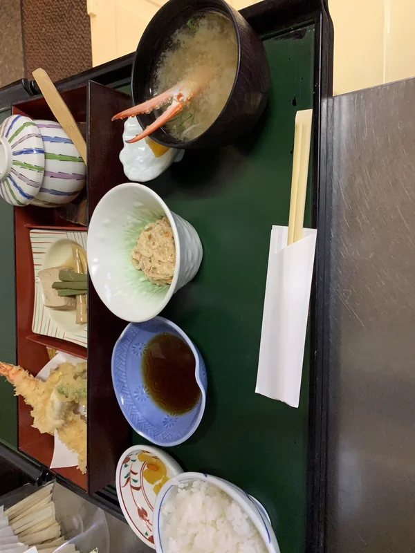 昼食は蓮町の四十萬亭 しじまてい さん。 お昼は大人気で行列必修のお店です。 さくら御膳1500円コーヒー付きをいただきました。お刺身、天ぷら、小鉢2皿に蟹のお味噌汁で大満足のお店です。四十萬亭蓮町ゲストハウス岩瀬。