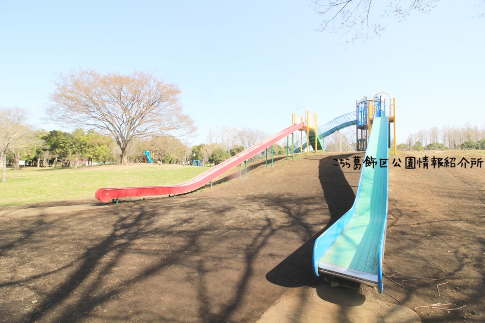 水元公園の冒険広場 大きな滑り台やターザンロープなどの遊具ありピクニックにおすすめの遊び場。