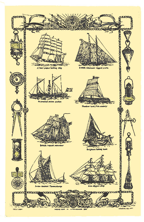 ティータオル 帆船の種類帆船の種類 型 が描かれているティータオル ガレークロス です。英国王室御用達UlsterWeavers社製のリネン 麻 製品です。