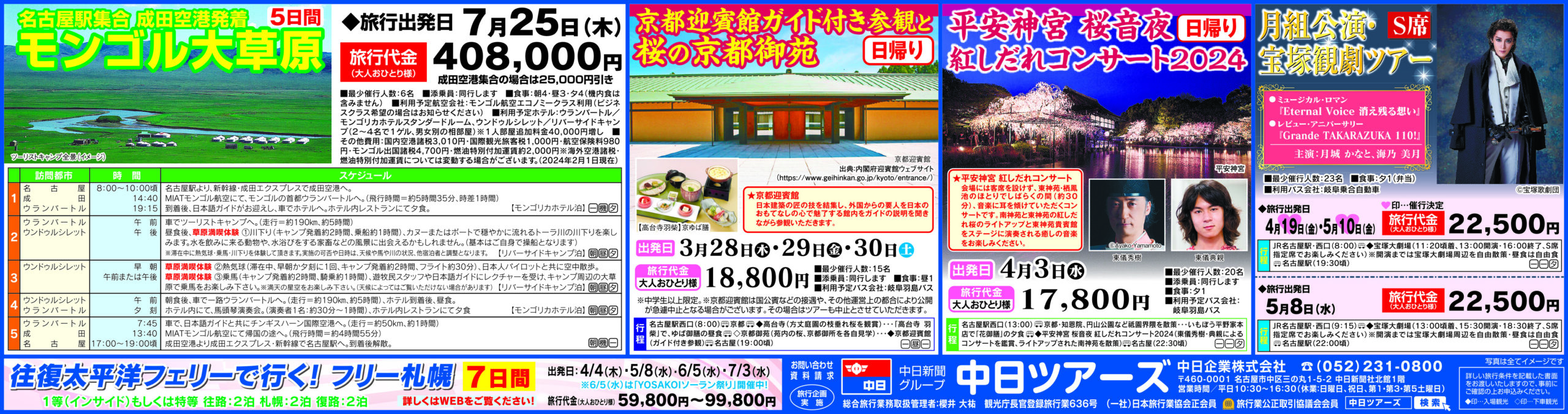 2024 2 28 中日新聞夕刊に掲載の広告モンゴル大草原、京都迎賓館日帰り、平安神宮紅しだれコンサート日帰り、宝塚公演月組日帰り-中日ツアーズ。