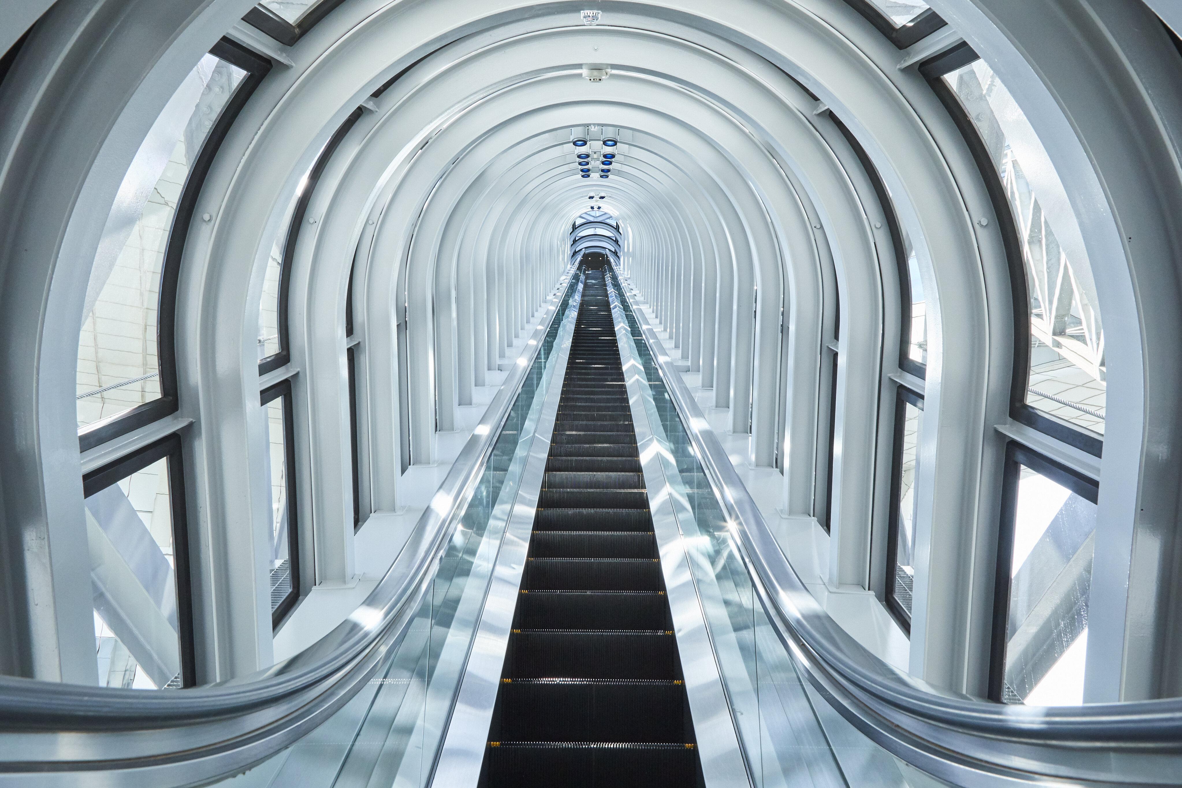 空中庭園展望台へと誘う35階と39階を結ぶシースルーの<空中エスカレーター> 昼と夜もどちらも、おすすめの映えスポット。 Thesee-through "Sky Escalator" connecting the 35th and 39th floors. Both dayand night, it's a recommended spot for stunning views。