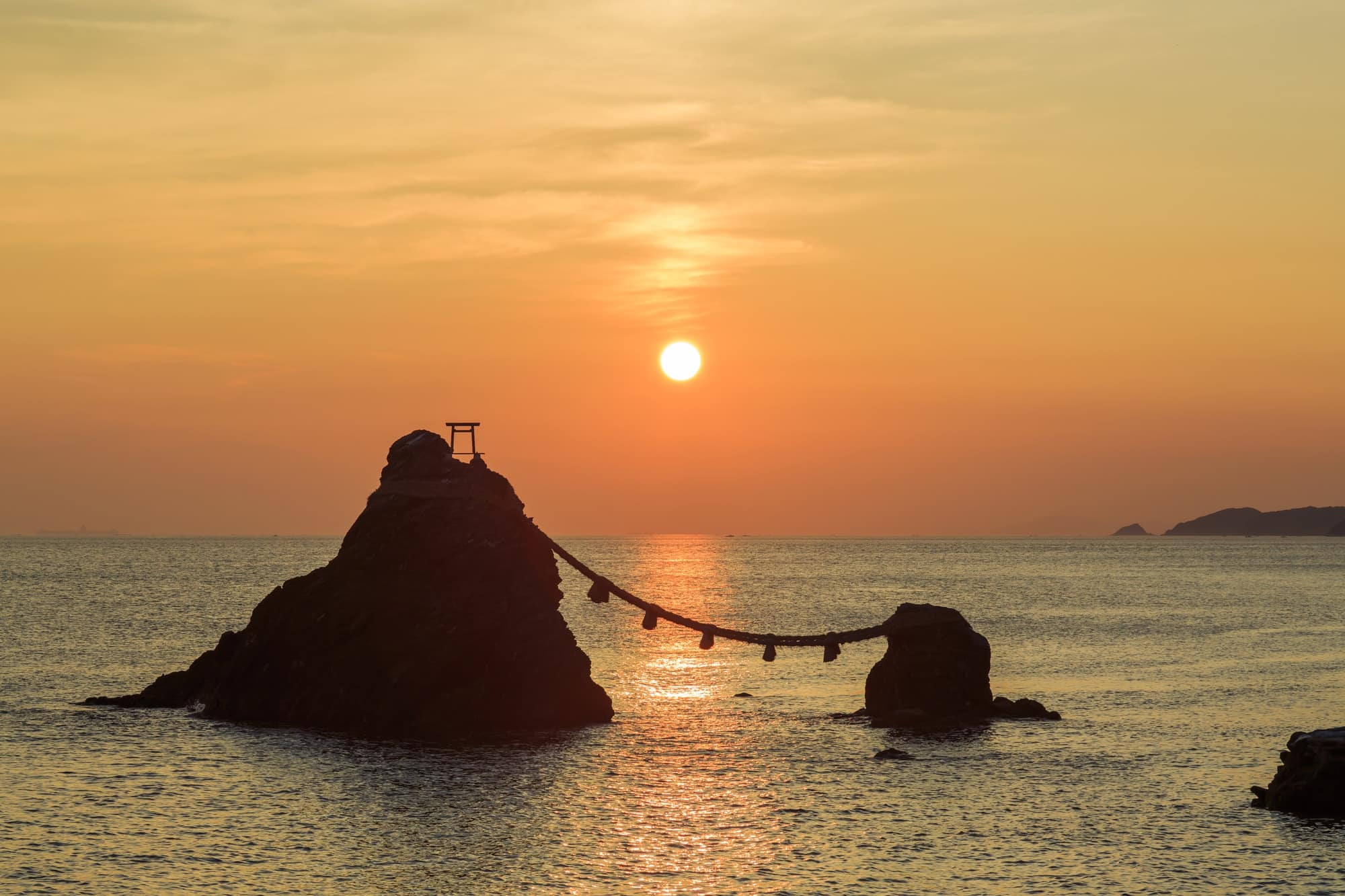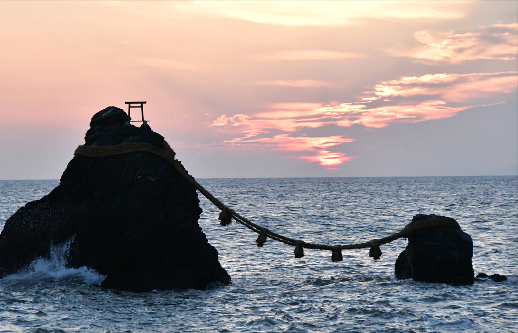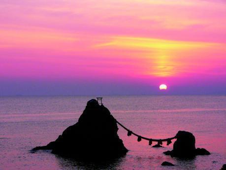 夫婦岩・初日の出 夫婦岩の間から朝日は昇りません公益社団法人 伊勢市観光協会。