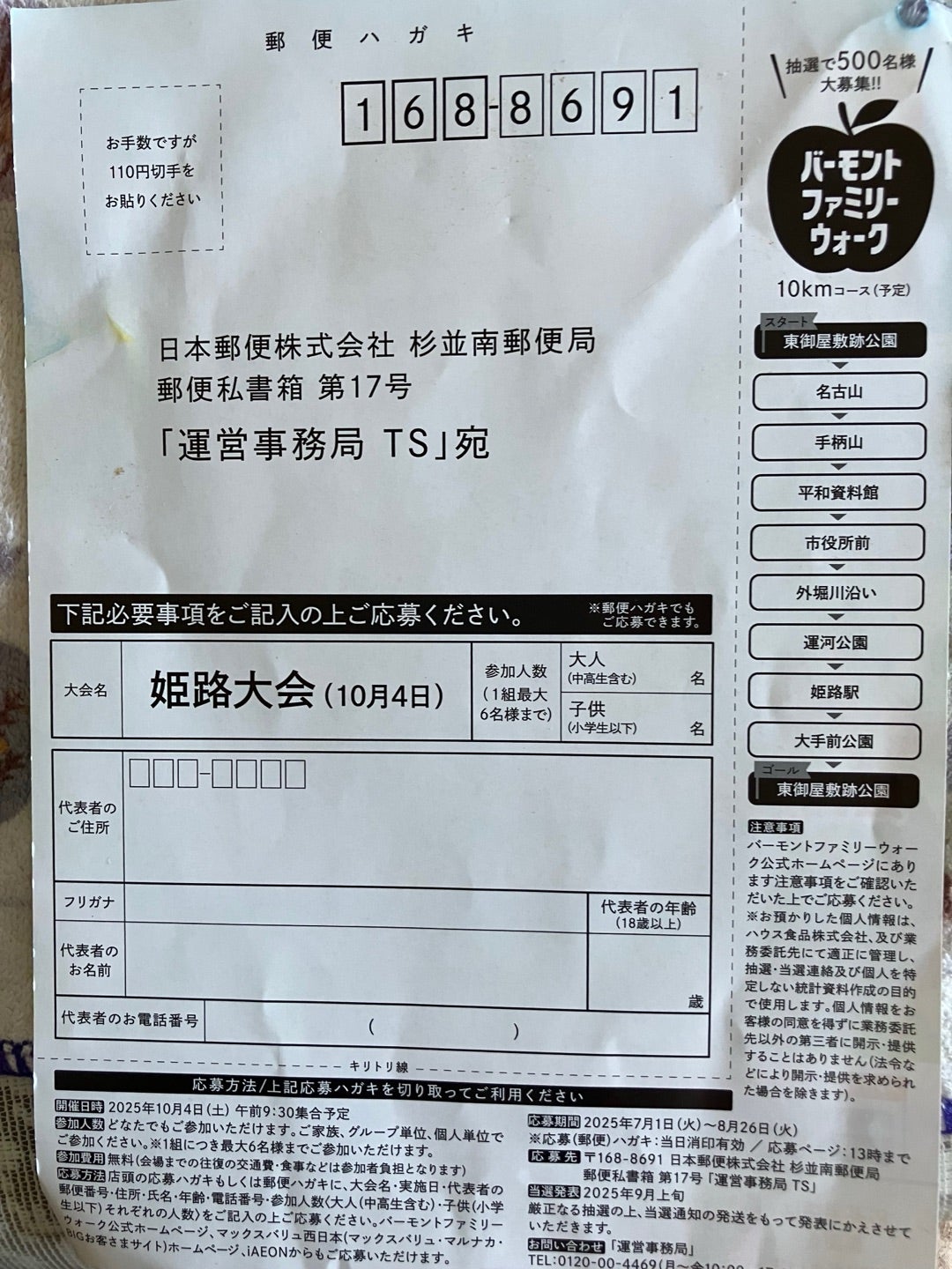 🏯バーモントファミリーウォーク姫路大会🚶 ウォーキングに参加してきました👨👩👦 応募2500中500組だったそうです🎯🤩👏小雨で、10キロ予定が5.5km になりましたが、先頭付近におり少し早めのペースで歩いていたので私にはちょうど良いあんばいでした😁💡 受付時に。