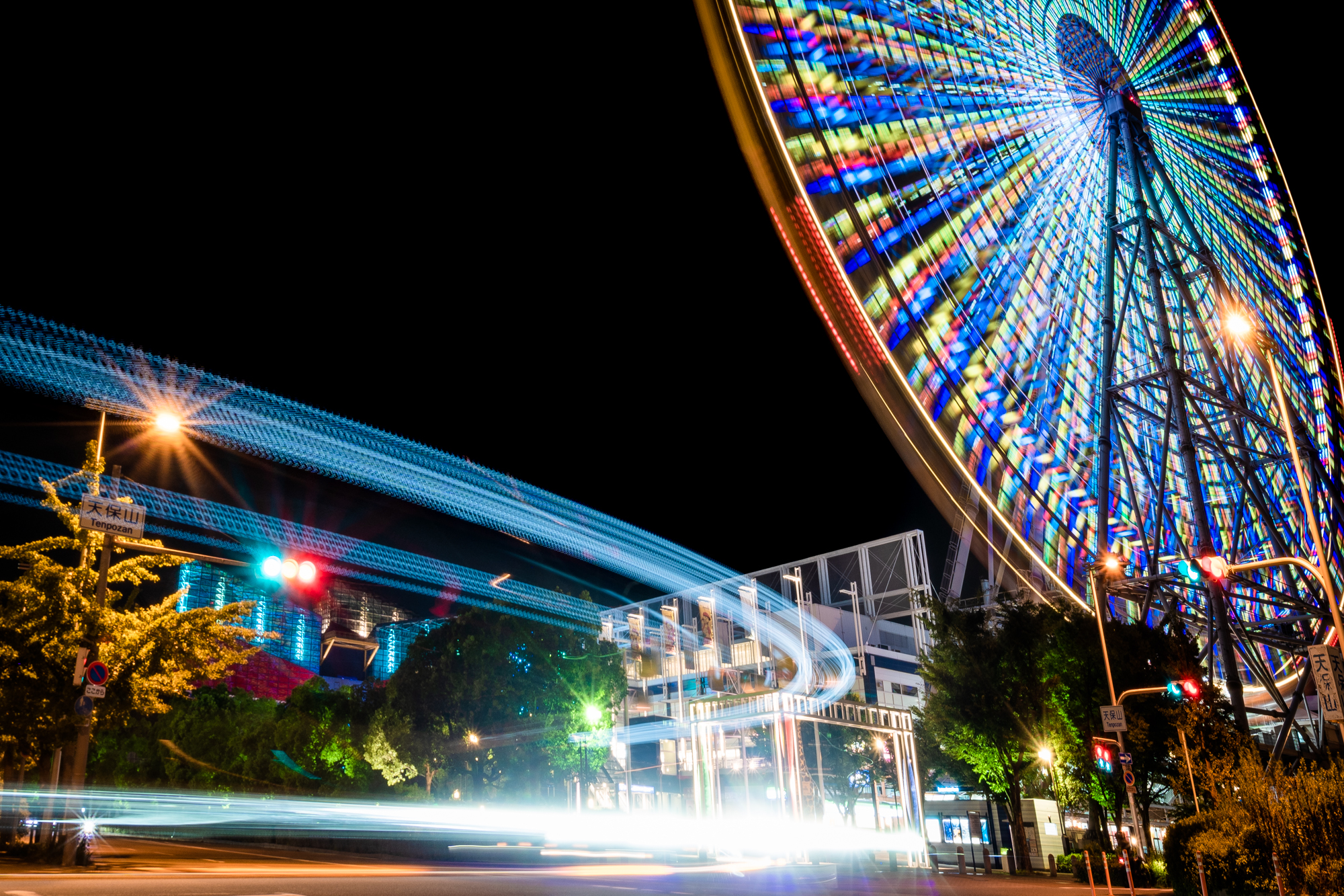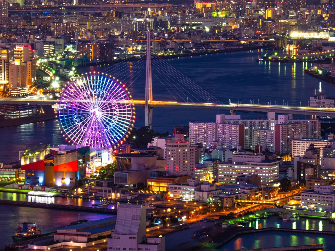 光のシンフォニーが奏でる大阪湾の夜景, 海遊館・天保山マーケットプレース・大観覧車の魅力,大阪を代表する観光スポット、海遊館、天保山マーケットプレース、大観覧車が織りなす夜景は、まさに幻想的な美しさ。,大阪湾に面した天保山エリアは、夜になるとまるで宝石を散りばめたような幻想的な光景が広がり,海遊館、天保山マーケットプレース、大観覧車がそれぞれ異なる光を放ち大阪湾の水面に映り込む様子は、まさに。