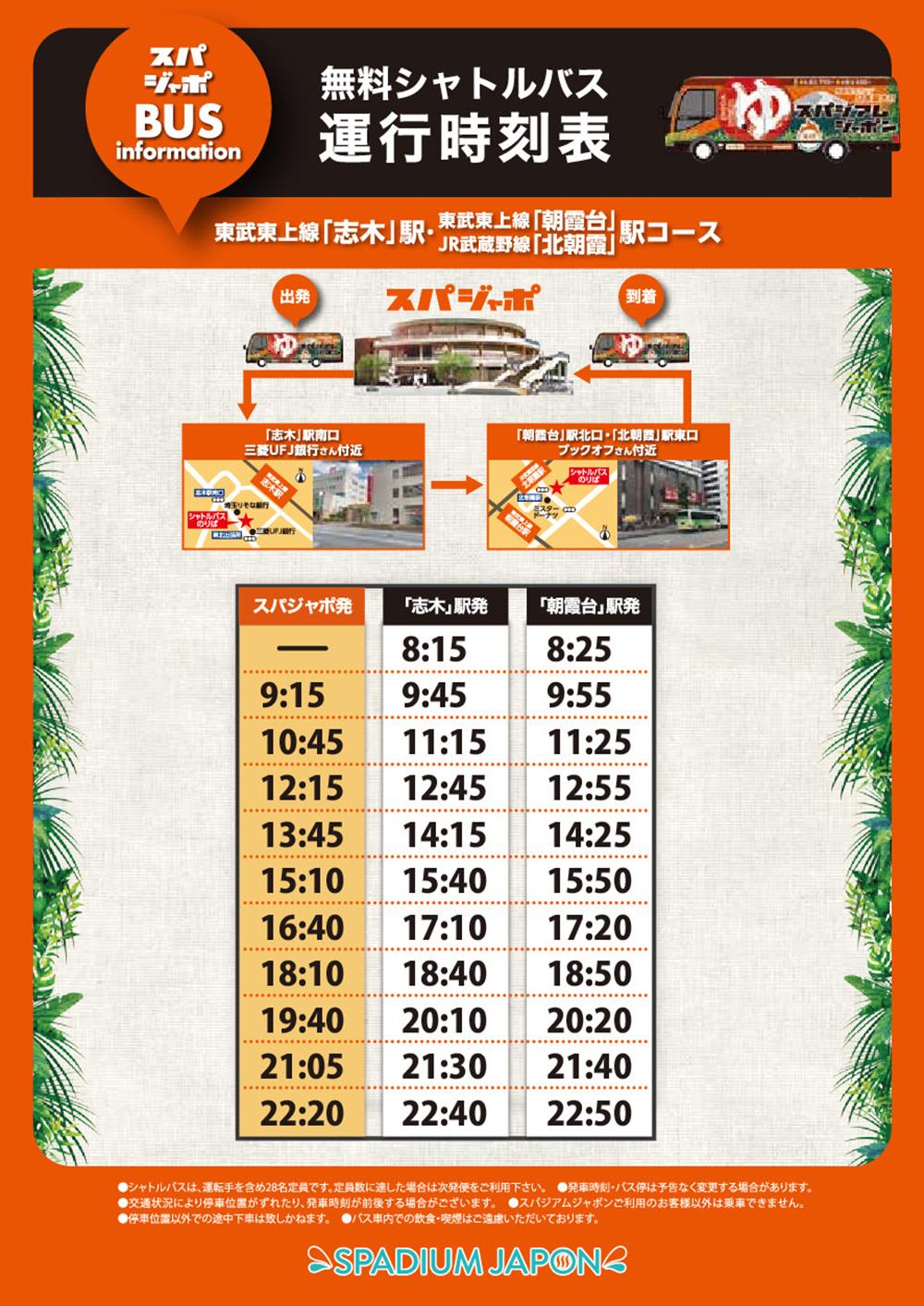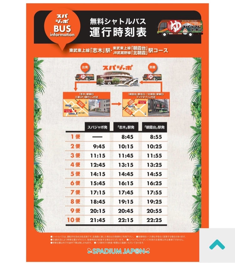 無料シャトルバス時刻表天然温泉 岩盤浴 スパジアムジャポンスパジャポ。