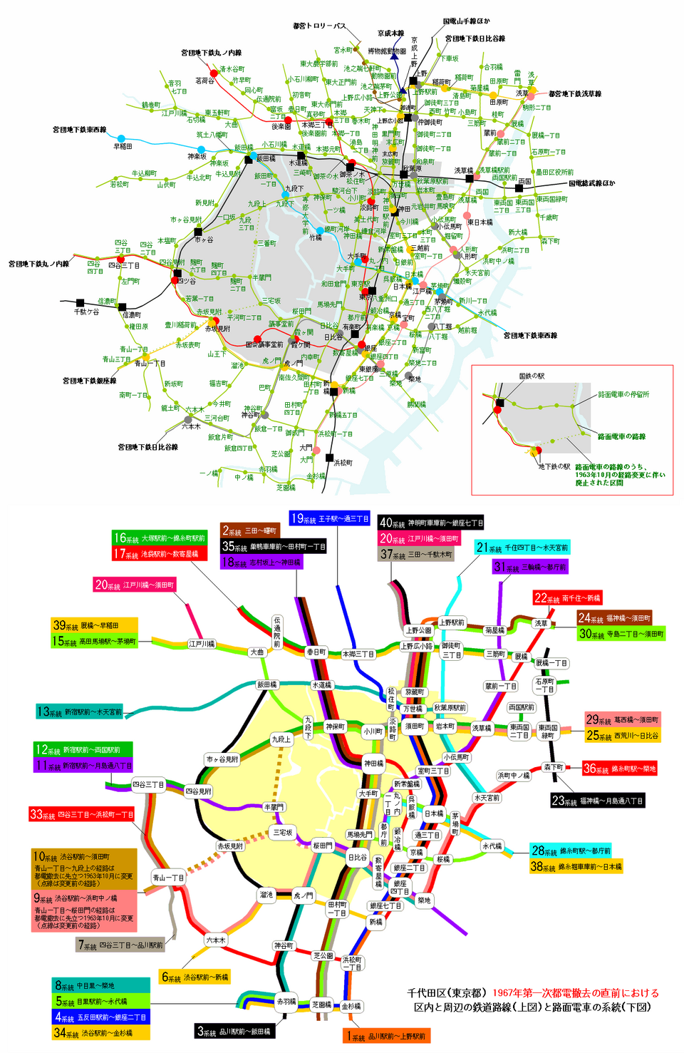 カオストレイン on X: " 路面電車シリーズ のラスボス・東京都電が最盛期だった頃の路線図をつくりました。 運行系統の多さはさすが首都!!このスペースに収めるのに大苦戦 ^^;ちなみに32系統・27系統の一部が、今の「都電荒川線」です。カオス路線図路面電車。
