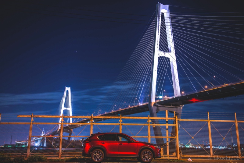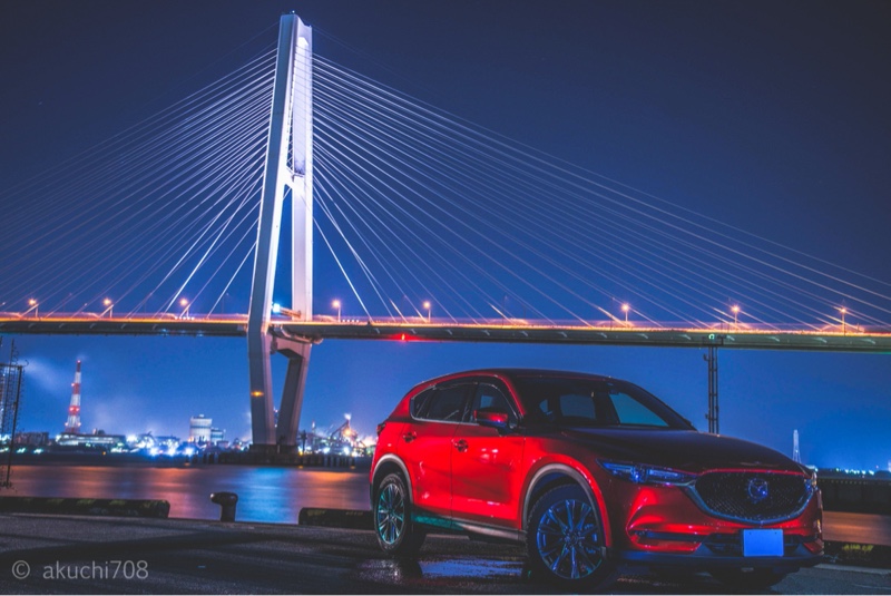 友達と写活へ! 友達のCX-8 @yukiban_4028 やはり、白ボディーは夜映えすんばらしい!名港トリトン撮影スポット。