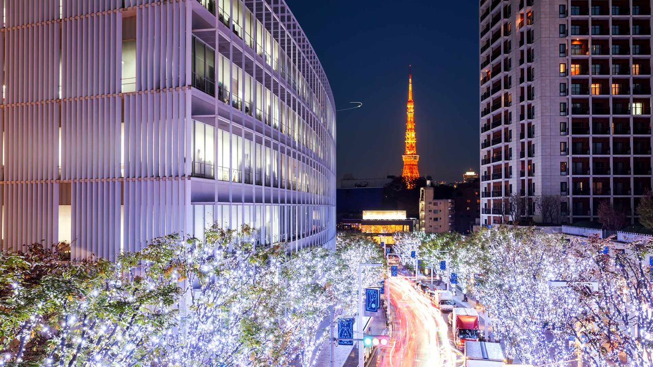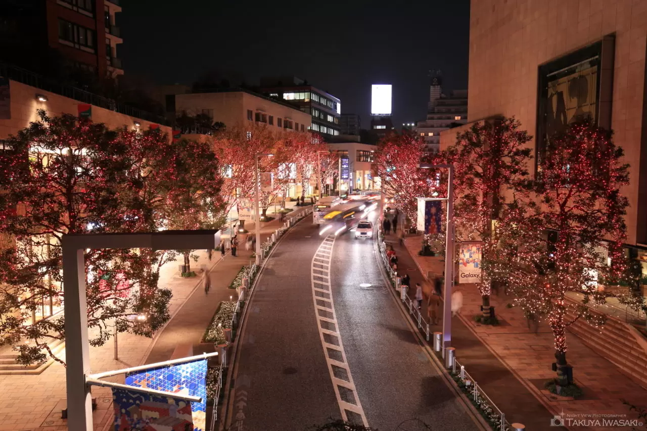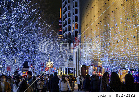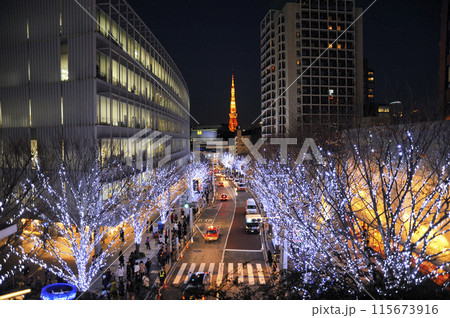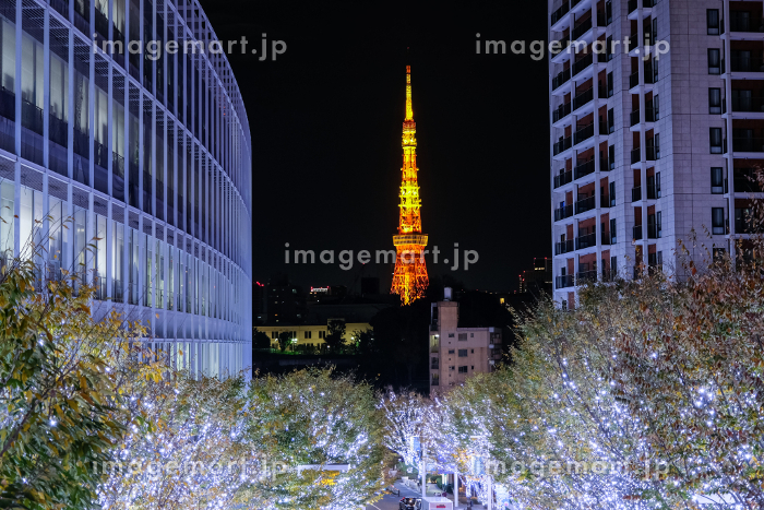 東京、六本木-2019年11月:東京タワーの景色を望むけやき坂通り六本木夜のイルミネーションと道路上の車からの照明、六本木ヒルズ、東京の写真素材・画像素材Image 183375255。