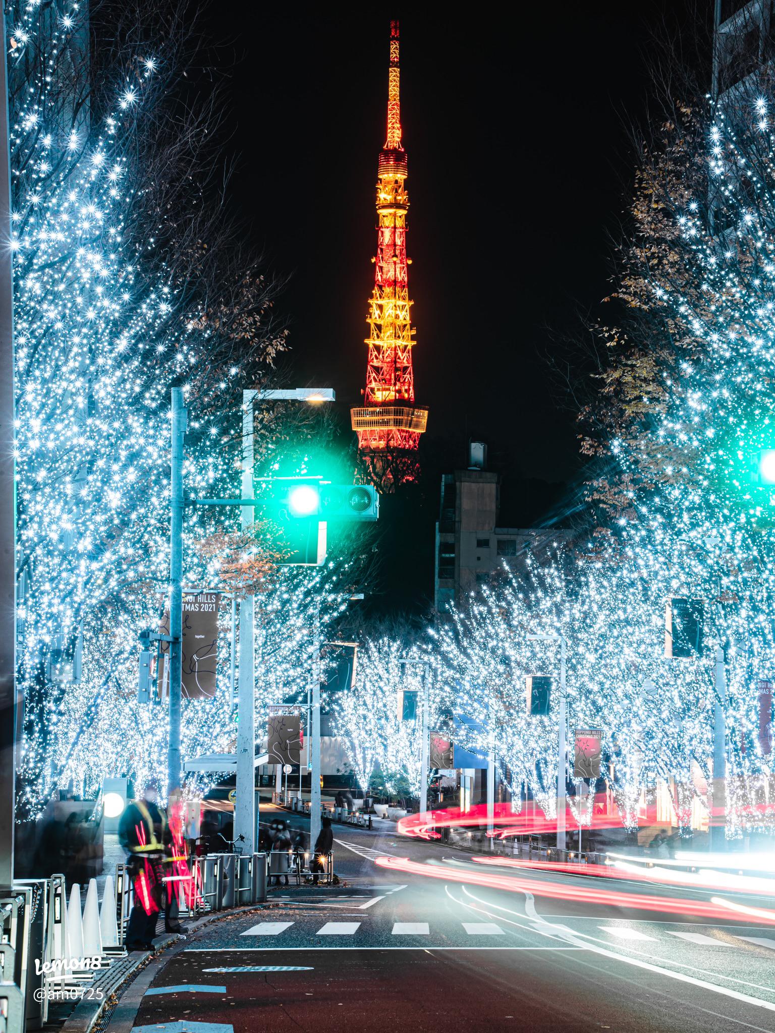 六本木ヒルズけやき坂のキラキラ✨✨と東京タワー🗼のコラボ。横断歩道は大騒ぎなので少し手前の歩道から。テールランプがいい感じで流れてくれました。 ・・your_tokyotower @tokyotower_official ↓東京タワーのライトアップの予定はここでわかりますhttps:www。