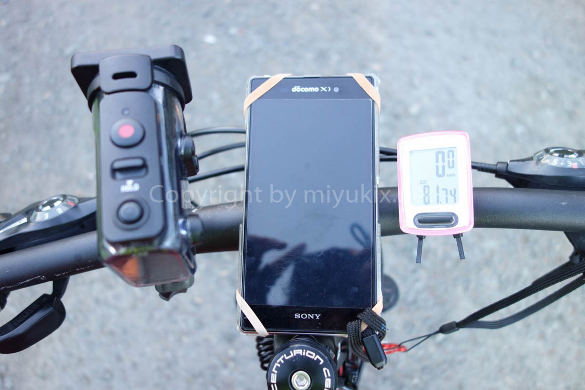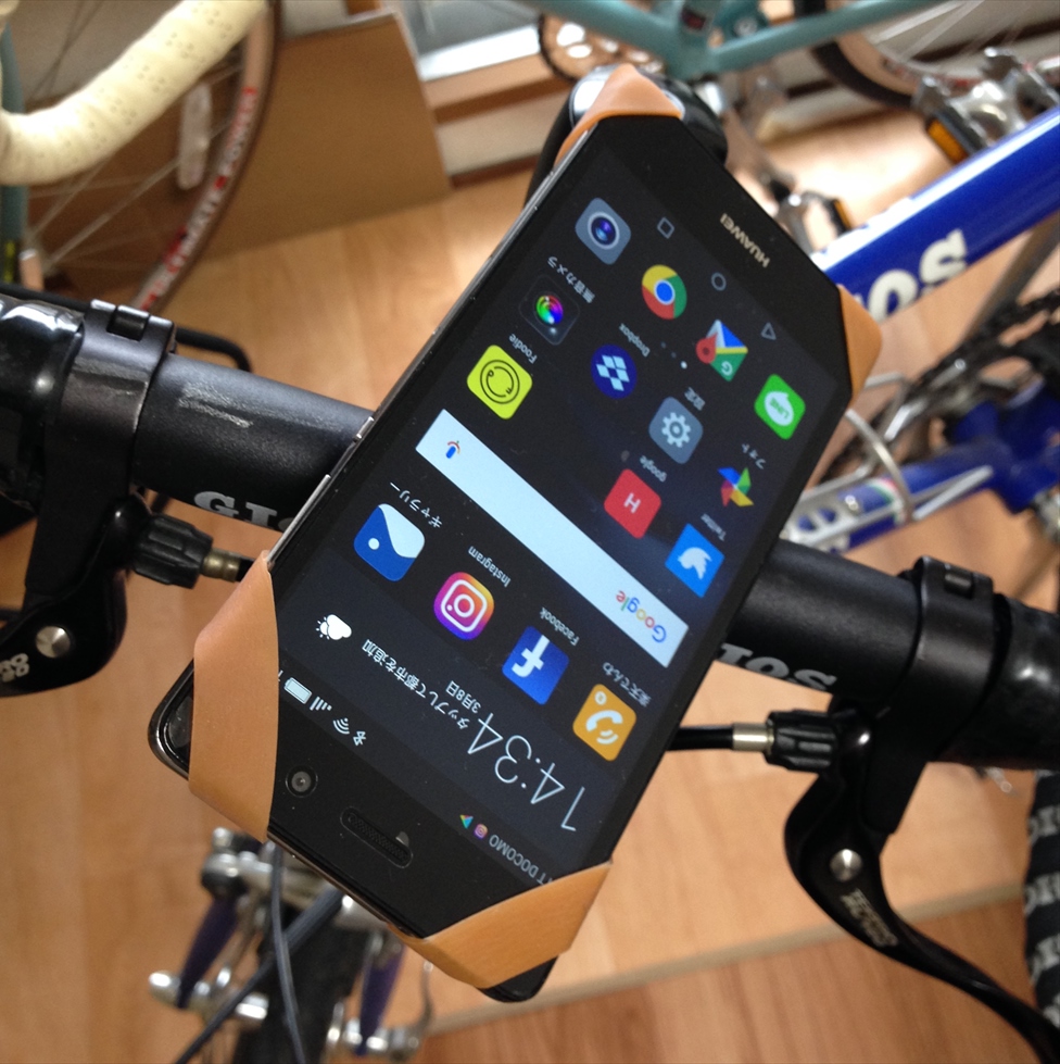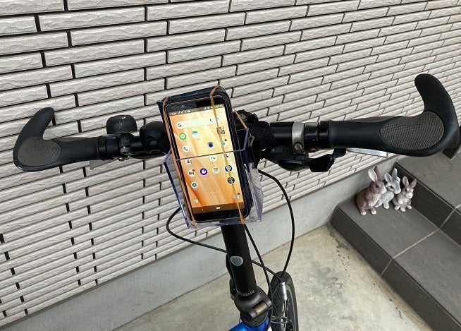 スマホを輪ゴムで自転車に付けてナビにする。いっちょかみ。