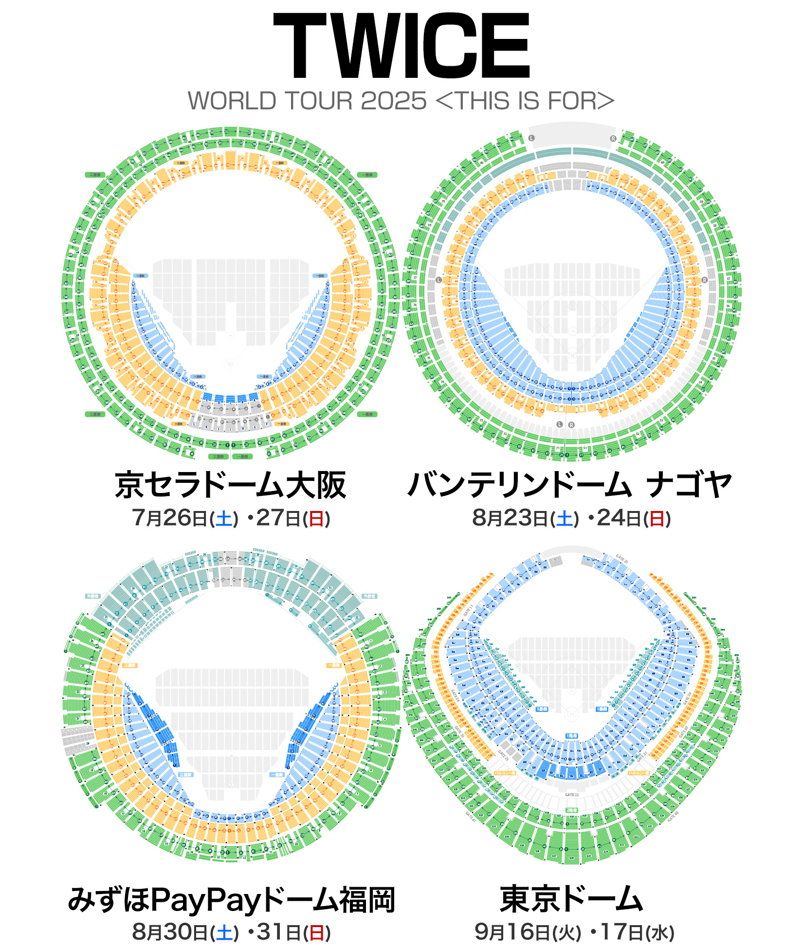 座席表ガイド No.1 on X: "TWICETHIS IS FORWORLD TOUR IN JAPAN 全国4ドーム 合計8公演 💺座席表 https:t.co 3o5j0pJsOa 🟥 京セラドーム大阪 大阪2025年7月26日 土 17:30 開演2025年7月27日 日 16:30 開演 🟨 バンテリンドーム ナゴヤ 愛知2025年。