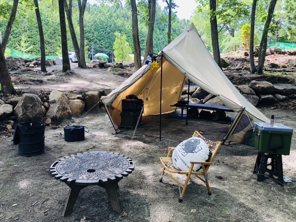林間サイトで静かなソロキャンプを楽しむGGCrewテーブルユーザーのおしゃれなサイト設営をご紹介します。GGCrew。