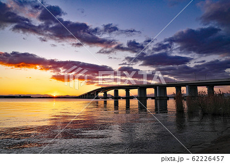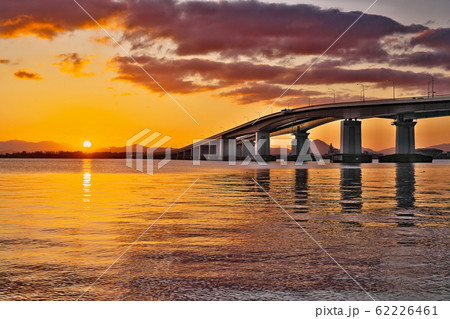 滋賀県 朝焼けの琵琶湖大橋 日の出 22456006212 の写真・イラスト素材アマナイメージズ。